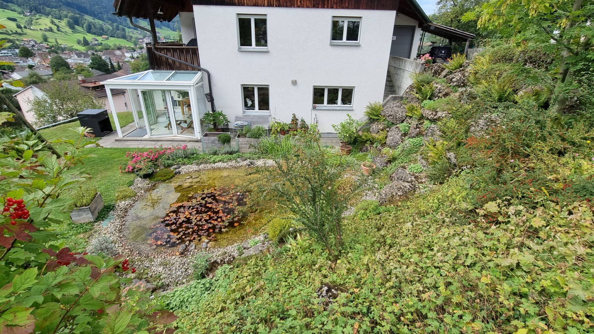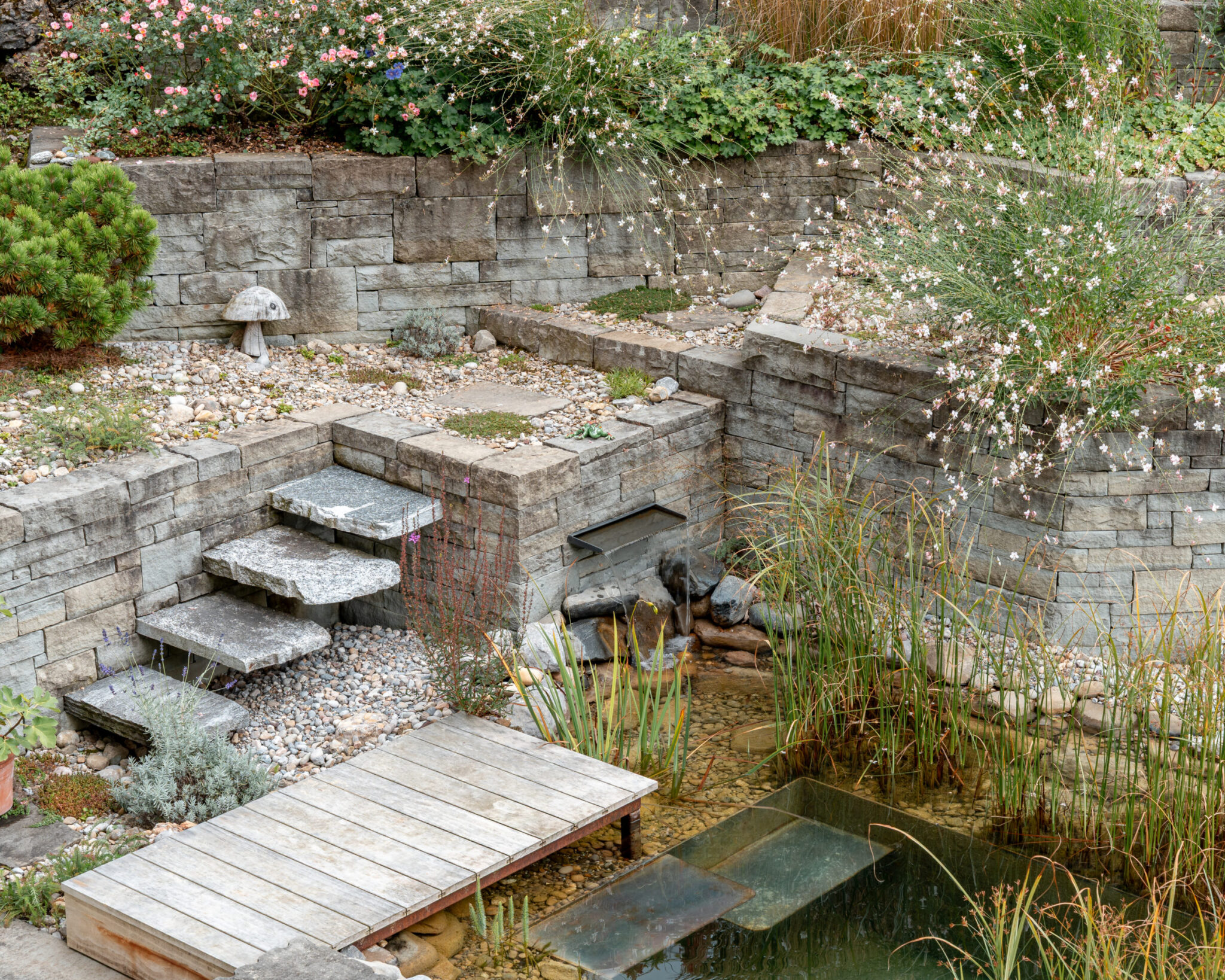 Durch Sandsteinmauern, Terrassierung und ein Kneippbecken entstand ein harmonisch gegliederter Garten mit klarer Linienführung.